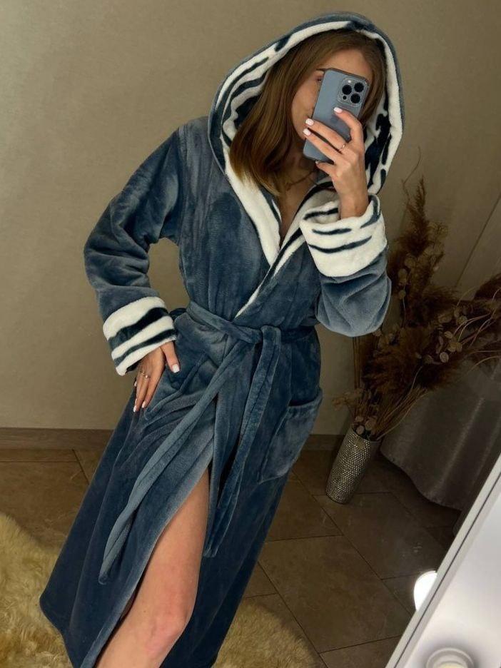 Жіночий довгий махровий халат сірого кольору з капюшоном і поясом